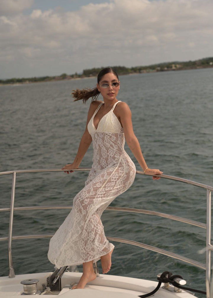 Vestido largo elaborado en blonda- Triángulos de copas forradas- Encuéntralo en horma SM y ML