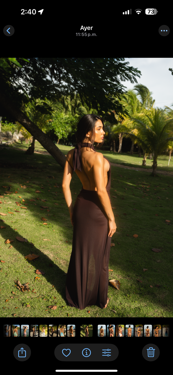 Vestido elaborado en mamlatex, con copas cruzadas en busto, escote en abdomen, fruncido en falda y abertura delantera.