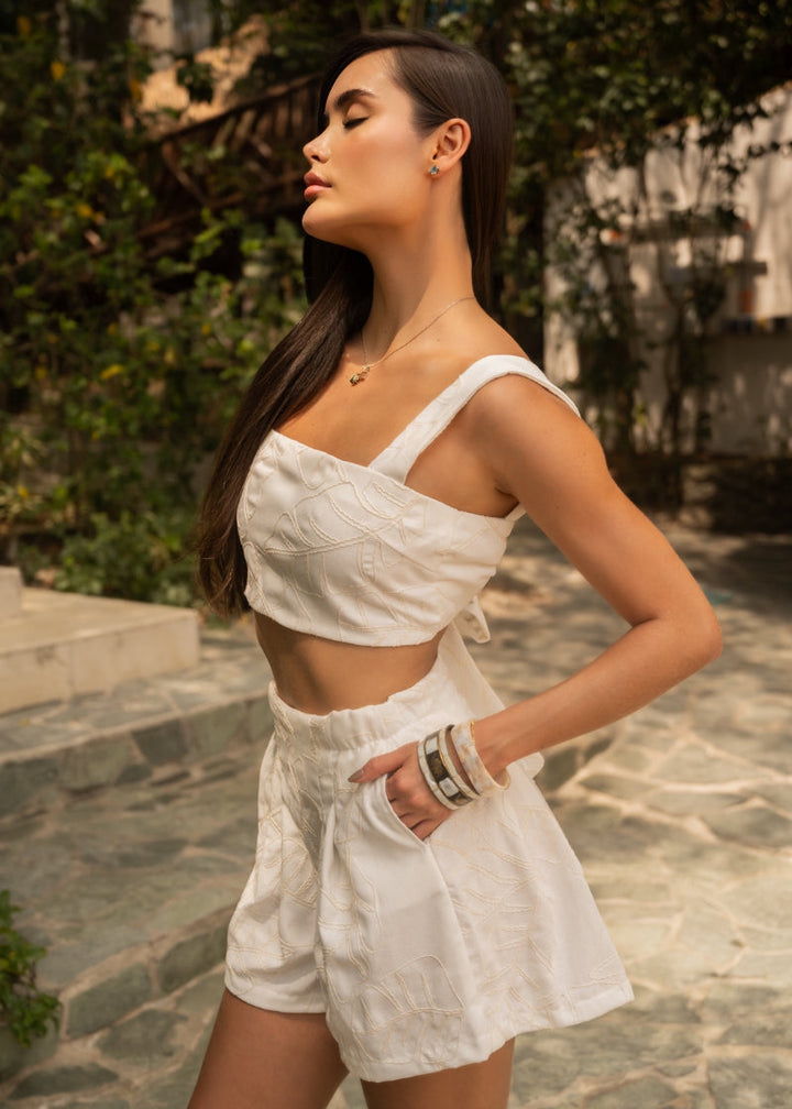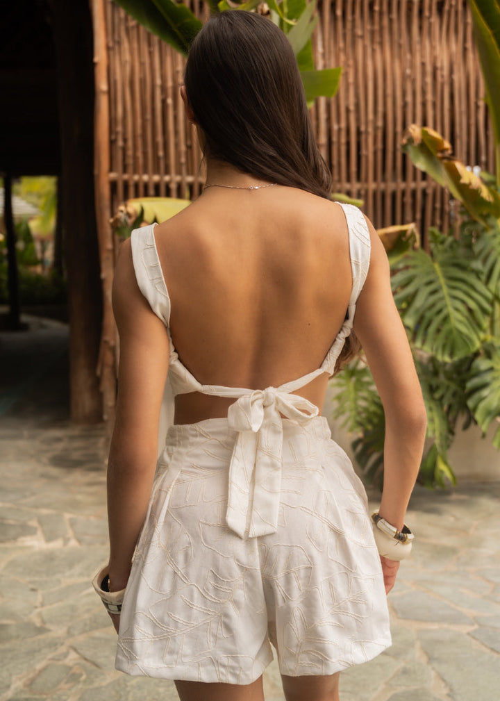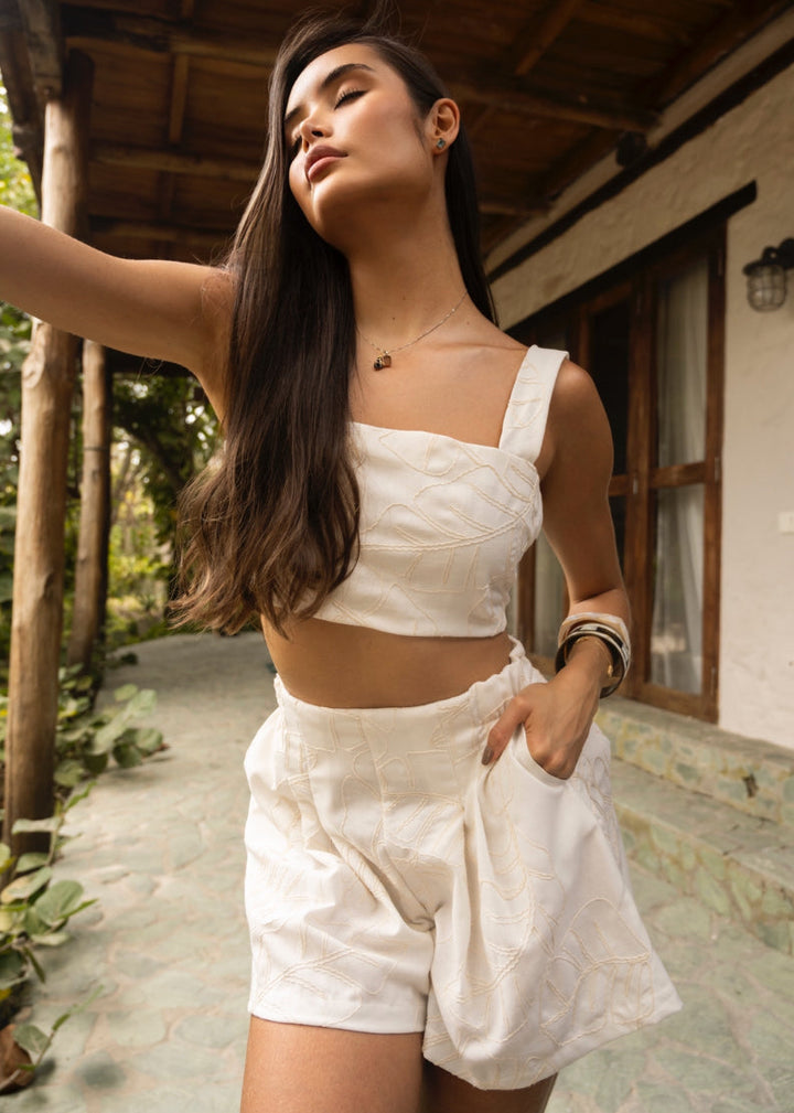 Set de short con crop top elaborado en tela con borrado delicado de palmas en tonos beige